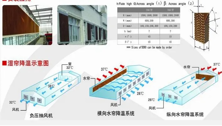 三、降溫系統(tǒng) 1、水簾:一般為紙質(zhì)材料,在炎熱夏季通風(fēng)降溫使用。 2、濕簾:由波紋狀纖維紙粘結(jié)而成,水流均勻、風(fēng)阻小、能承受較高的過(guò)簾風(fēng)速,具有耐腐蝕,不易滋生苔菌,使用壽命長(zhǎng)等特點(diǎn),與風(fēng)機(jī)組合能達(dá)到最佳通風(fēng)降溫效果。