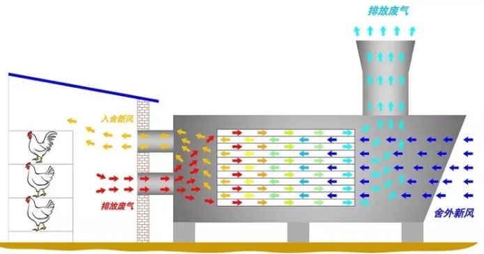 四、熱交換系統(tǒng) 熱交換系統(tǒng)通常由熱風(fēng)爐、夾層風(fēng)道、煙道、膨脹節(jié)、散風(fēng)管、主風(fēng)機(jī)、引風(fēng)機(jī)及電氣溫控等構(gòu)成。能夠利用舍內(nèi)排出廢氣的熱量來(lái)預(yù)熱進(jìn)入舍內(nèi)的新鮮空氣,為雞場(chǎng)提供新鮮空氣的同時(shí),減少氨氣排放,保護(hù)周邊環(huán)境,節(jié)省供熱的能源成本。