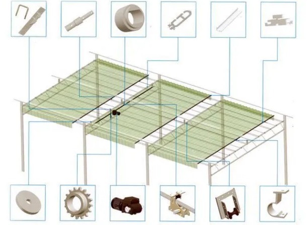 二、遮陽系統(tǒng) 遮陽系統(tǒng)主要包括外部遮陽系統(tǒng)和內(nèi)部遮陽系統(tǒng),主要用于驅(qū)動遮陽網(wǎng)的開啟和關(guān)閉,冬季陽光缺乏時開啟使陽光多入,夏季時關(guān)閉或關(guān)小阻擋多余的陽光。 1、外部遮陽系統(tǒng):溫室大棚頂部安裝外遮陽骨架,覆蓋黑色遮陽網(wǎng)由電機帶動齒輪傳動鏈接推拉桿實現(xiàn)自動操作,遮陽率大概在75%左右。 2、內(nèi)部遮陽系統(tǒng):內(nèi)遮陽的遮陽幕布一般是白色的,傳動裝置和外遮陽無差,屬于鋁箔遮陽網(wǎng),能夠有效防止溫室內(nèi)部溫度散失。