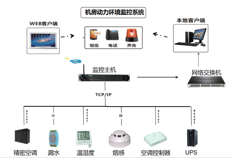 小型機房不同于大型機房,機房面積小、設(shè)備少,也因此管理難度相對小,但也需要機房環(huán)境監(jiān)控系統(tǒng)對機房環(huán)境以及動力設(shè)備進行實時監(jiān)測、控制和管理。小型機房環(huán)境監(jiān)控系統(tǒng)功能包括: