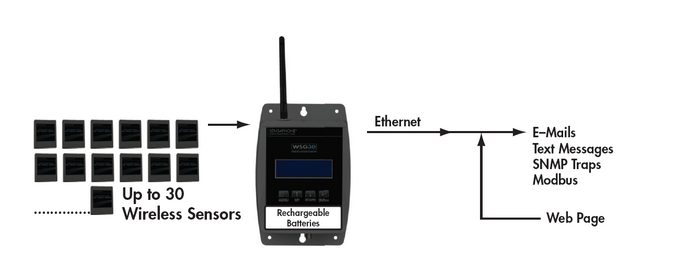 1、Sensaphone WSG30 是什么 Sensaphone WSG30 是一款基于 WEB聯(lián)網(wǎng)的連接無線型傳感器的遠程監(jiān)控系統(tǒng),這種特殊的連接方式最常應用于需要動態(tài)監(jiān)測(有先傳感器不便)的環(huán)境下。此外,還可以直接與工業(yè)自動化系統(tǒng)連接進行通信,實現(xiàn)對環(huán)境參數(shù)、設備參數(shù)和運行狀態(tài)以及傳感器狀態(tài)、離線、電池低等的監(jiān)測與管理。 2、Sensaphone WSG30 的性能特點 (1)采用壁掛式外殼,并配有80個字符的液晶顯示屏。 (2)可記錄、處理多達67000條帶有日期和時間的數(shù)據(jù)記錄。 (3)可實時在線訪問系統(tǒng)狀態(tài),以及在線更改程序。 (4)能夠獨立發(fā)送電子郵件和短信報警通知。 (5)該產品內置可充電電池備份、數(shù)據(jù)記錄和擴展的溫度傳感范圍。
